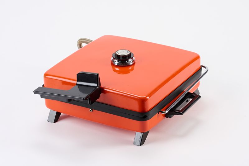 ELEKTRIČNI KONTAKTNI ŽAR ALI OPEKAČ ZNAMKE ISKRA, ORANŽNE BARVE. NA ZGORNJEM DELU IMA GUMB ZA VKLOP IN TERMOSTAT.